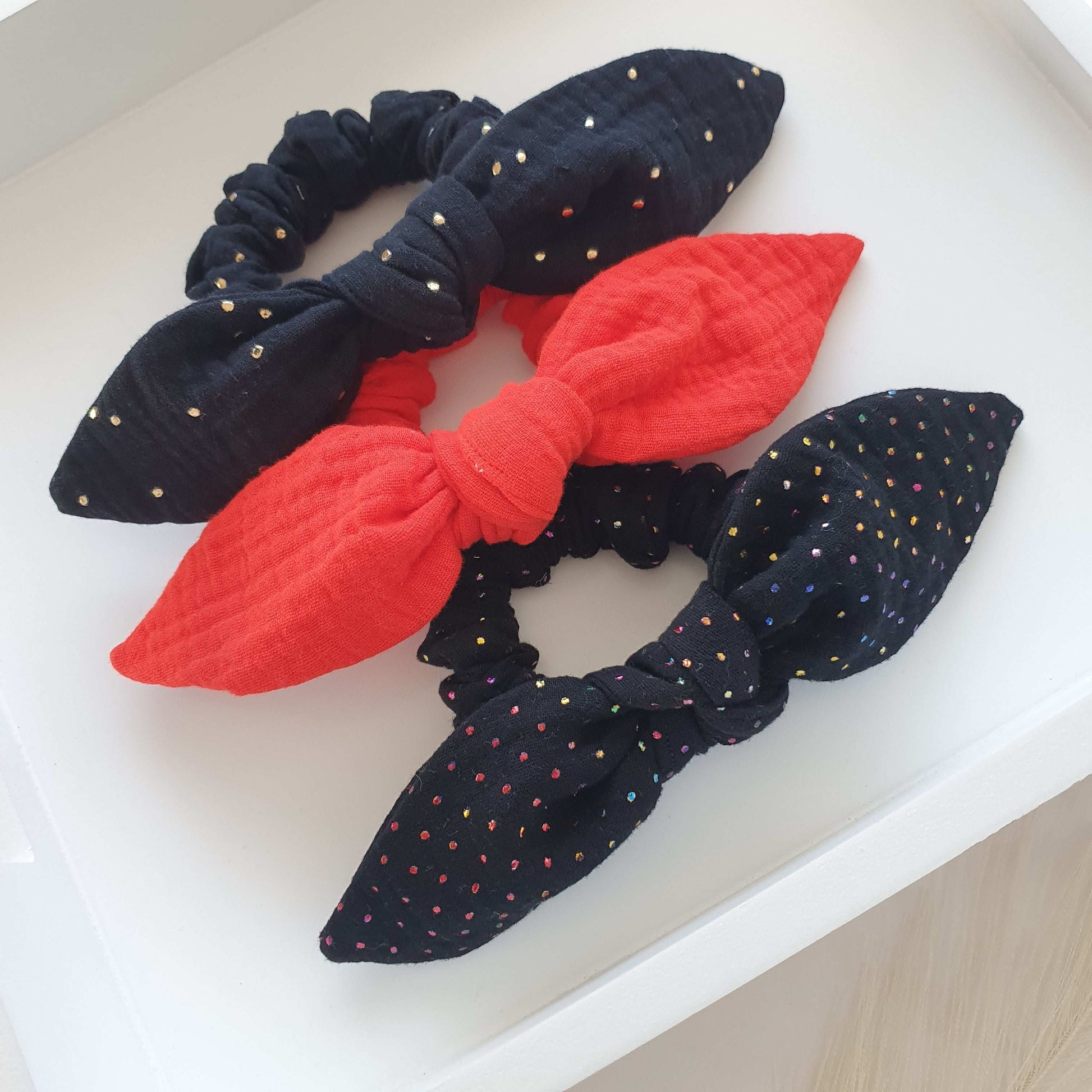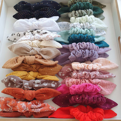 Nos foulchies sont 2-en-1 ils se transforment selon vos envies en détachant le nœud pour devenir un simple mini chouchou